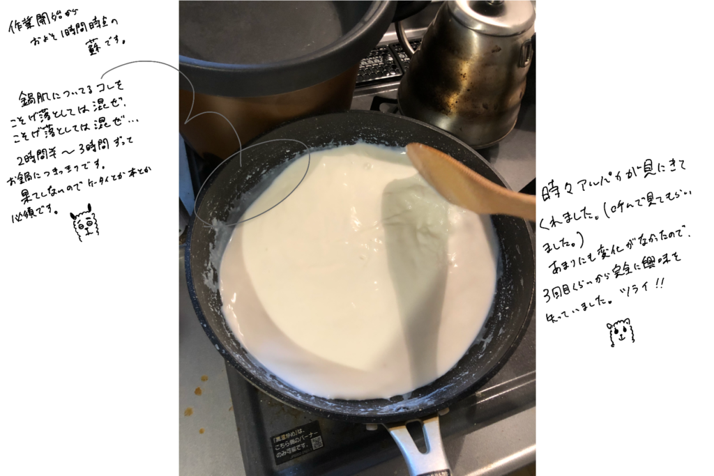 殆どの時間は牛乳が焦げないように木べらで混ぜるだけで、全く手応えがありません。鍋肌にちょっと固体ができるのですが、剥ぎ取っても剥ぎ取っても手応えがないです。2時間30分くらいそんな状態が続き、心がだんだんと死んでいきました。あらかじめ用意しておいたパイプ椅子に着席。Netflixでアニメ見ながら混ぜ混ぜします。