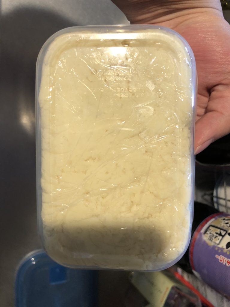 ここから加速度的に忙しくなります。鍋底に固体がどんどん出来るので、結構必死でかき混ぜないと焦げ付きそうでした。写真撮ってる余裕無し。最終的にドロドロネバネバの塊になるので、ラップで包んで良い感じに成形し、固めました。